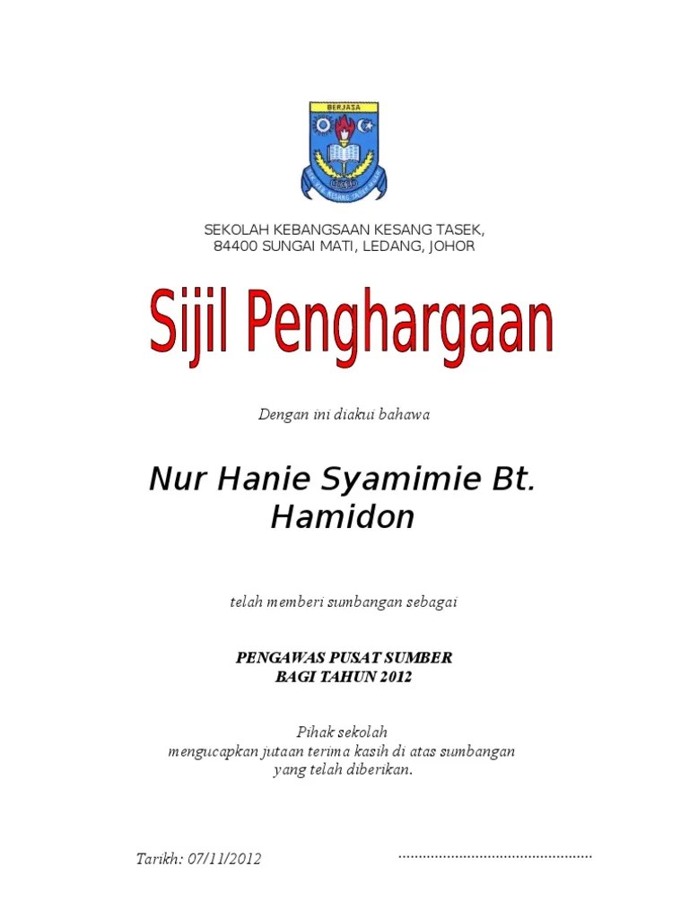 Jika anda ingin dapatkan bahan yang boleh diedit, boleh rujuk pada link kami di atas. Abd rais bin mohd nawawi di atas sumbangan beliau sebagai Sijil penghargaan penceramah download doc. Terima kasih kepada taj international college atas sumbangan latihan vgeniust7r bagi smk puteri seremban. Atas kerjasama dan sumbangan dalam menjayakan .